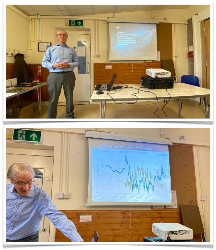 On Mon 13th May we were fortunate to have Andrew Thomas of the UK Radio Astronomy Association give a fascinating presentation on amateur radio astronomy. He covered history, practical observing, geophysics and the sun, and several projects/kits available to the amateur radio astronomer. We had experienced the effects of the solar storm that had occurred only a few days previously – it wiped out the first day of our operations at Nutley Windmill. Andrew added some extra slides on measurements of the storm taken by his instruments, including an impressive graph of his magnetometer signals (shown below) – clearly illustrating the strongest magnetic storm for 20 years. Andrew is not an amateur radio operator, but there is obviously a cross-over between his area of interest and ours.